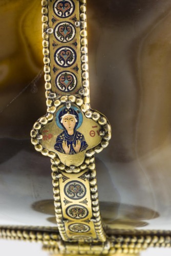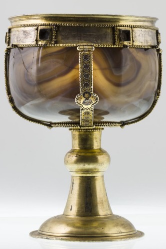 - NOTIZIE STORICO CRITICHE Il piede è un'aggiunta di epoca posteriore. Secondo lo studio di Hahnloser (1971) l'opera fu forse realizzata a Costantinopoli, in considerazione della qualità dell'intaglio della coppa e degli smalti, presumibilmente tra la seconda metà del X e gli inizi dell'XI secolo. Gli anellini erano usati per ulteriori decorazioni pensili andate perdute