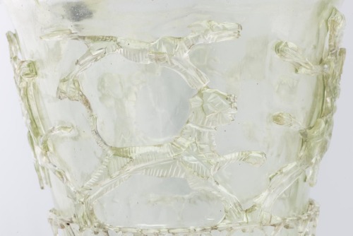 - NOTIZIE STORICO CRITICHE Appartiene ad un limitato gruppo di oggetti vitrei di lusso chiamati "diatreta", caratterizzati da una raffinata decorazione ottenuta con l' intaglio di un blocco di vetro, generalmente di strati di colore diverso. La loro massima diffusione è rilevabile nel IV secolo. Non è possibile stabilire l'ambito produttivo del manufatto del Tesoro, per cui lo studio dell'Hahnloser (1971) propone una datazione più avanzata per lo spessore del vetro e lo stile della raffigurazione