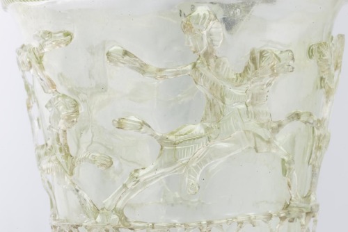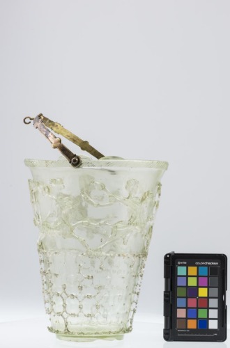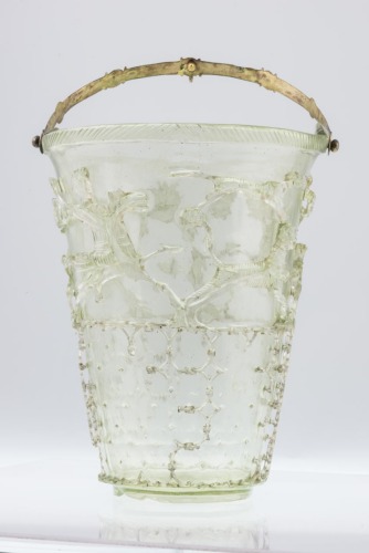 Secchiello in vetro incolore con piede ad anello, corpo troncoconico e orlo ingrossato decorato da linee oblique. Manico in bronzo con ingrossamenti anulari e gancio centrale. Presenta una decorazione in vetro verdognolo realizzata a intaglio, composta da due fasce sovrapposte. Quella inferiore, compresa entro due linee a rilievo, è costituita da una rete formata da cerchi sovrapposti, collegati alla superficie del vaso grazie a dei ponticelli di sostegno. Nella fascia superiore vi è una scena di caccia in cui compaiono due cacciatori su cavalli in corsa, uno con una lancia e l'altro nell'atto di lanciare un oggetto, che con due cani danno la caccia ad una pantera. Tra le figure sono inseriti degli elementi vegetali. Sul fondo vi è una rosetta a forma di stella