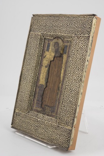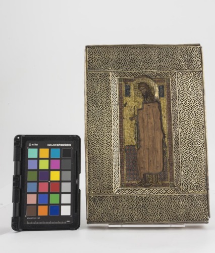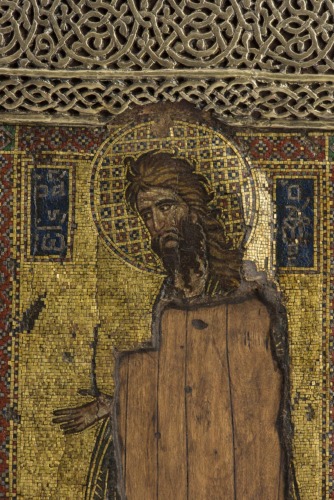 Icona con anima in legno, con una raffigurazione rettangolare a mosaico al centro, che rappresenta il santo in piedi, a figura intera, su fondo oro. La testa è circondata da un nimbo a motivi a quadrati, mentre la pavimentazione su cui poggiano i piedi del santo è ornata da un motivo a losanghe. Il rettangolo a mosaico è circondato da un'ampia cornice in argento dorato, con fitto reticolo a traforo: attorno al santo è a trecce a quattro capi, per la restante parte a fitte maglie