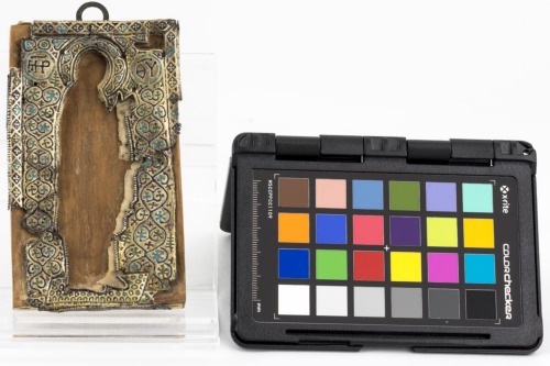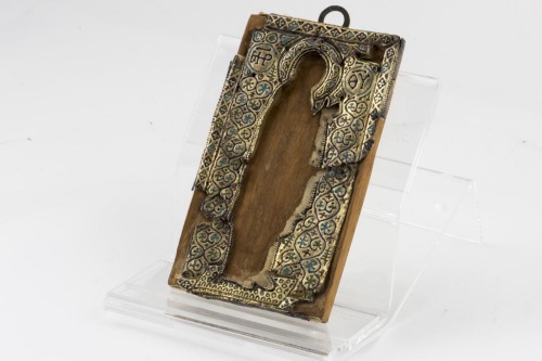 Rivestimento d'argento dorato su legno e seta di un'icona relativa alla Vergine Calcoprateia di cui resta solo il profilo tracciato da una cornice d'argento dorato con girali fitomorfici a tralci annodati sul fondo, dove si dispongono a cuore, e sul nimbo. Il bordo è profilato da un motivo a losanghe con elemento cruciforme inscritto. Gli incavi della decorazione sono riempiti di smalto blu