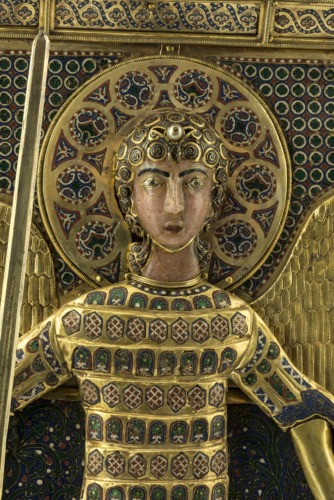 - ISCRIZIONI ai lati della testa dell'arcangelo, entro cartigli - AP MI - maiuscoli - a smalto cloisonnè - greco