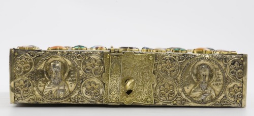 Scatola rettangolare in argento dorato con anima in legno, con chiusura costituita da una banda rettangolare collegata alla serratura e da una linguetta superiore in argento dorato, entrambe decorate da motivi a spirale doppia disposte a cuore. La parte superiore del contenitore, che è dotata di coperchio scorrevole, è decorata da elementi a smalto e pietre, mentre la parte retrostante è solamente in argento dorato, con una croce a sbalzo e motivi vegetali. I bordi laterali sono anch'essi in argento dorato, decorati da dieci medaglioni circolari a rilievo con i busti dei vescovi Gregorio, Giovanni Crisostomo, Basilio e Nicola da una parte, e i santi Eustazio, Procopio, Giorgio, Teodoro, Demetrio e Niceta dall'altra. Ai busti si alternano gruppi di quattro girali fitomorfici con terminazione a foglia. Al centro di uno dei lati corti vi è la serratura, inquadrata da un elemento quadrilobato con motivi vegetali incisi, nell'altro un elemento a doppio fiore sbalzato tra due medaglioni figurati. All'interno della cassetta vi è un altro pannello in argento dorato con una croce a doppia traversa a traforo, che custodisce i frammenti della Croce