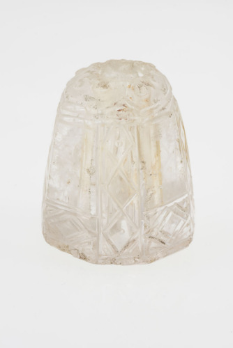 Cristallo di rocca a forma troncoconica, con sezione leggermente ottagonale a facce irregolari. Diviso verticalmente in quattro parti da fasce incise a tre rombi sovrapposti. In basso è delimitato da una banda orizzontale a losanghe con profilo raddoppiato. Nella parte sommitale invece si trovano otto cerchi umbonati. E' attraversato verticalmente da un foro circolare