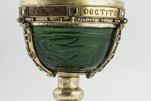 Coppa emisferica in spesso vetro verde; fondo apodo piatto con tre anelli concentrici appiattiti. E' decorata a intaglio da quattro lepri stilizzate in corsa, rivolte verso sinistra, con muso cuneiforme, gambe ripiegate verso l'interno e coda sagomata a triangolo acuto. Al di sopra corre una modanatura liscia
