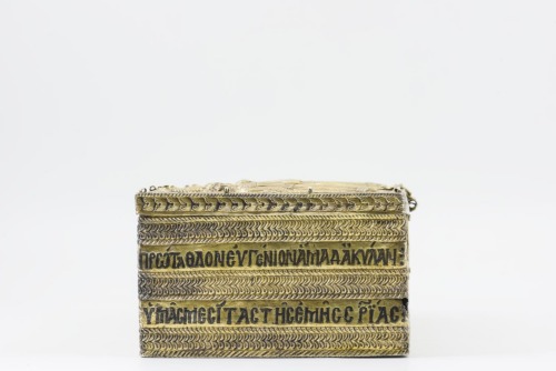 - NOTIZIE STORICO CRITICHE E' probabile che l'oggetto provenga da Trebisonda, come le reliquie che doveva contenere. Forse fu donato a Venezia (presumibilmente prima della caduta della città nel 1461) dal cardinale Bessarione, originario di Trebisonda, o da una famiglia della città trasferitasi a Creta agli inizi del XV secolo. L'iscrizione sui fianchi è composta da dodici trimetri giambici: ogni verso è separato da tre punti verticali