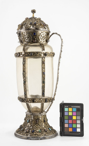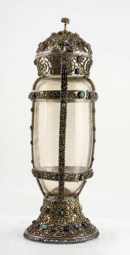 Vaso monoansato con parte centrale in vetro e montatura in argento dorato. Piede tronococonico svasato, decorato da volute in filigrana, con pietre incastonate disposte su due linee parallele. Lungo la base è presente una fascia inferiore piatta, decorata ad arcate. Elemento centrale costituito da un vaso tubolare in vetro. Copertura a cupola in argento dorato, decorata da spirali in filigrana suddivise in otto lobi, con pietre colorate incastonate; un alto bordo, con i medesimi motivi spiraliformi in filigrana, corre sotto la copertura a cupola. Piccola presa sommitale costituita da un elemento conico e da una terminazione sferica in filigrana. Una grande ansa si imposta nella parte terminale del piede e si connette alla fascia inferiore della copertura. Il vaso in vetro è ingabbiato da due fasce orizzontali e da quattro bande verticali; tutti questi elementi, compresa l'ansa, presentano la medesima decorazione a spirali in filigrana con pietre colorate incastonate
