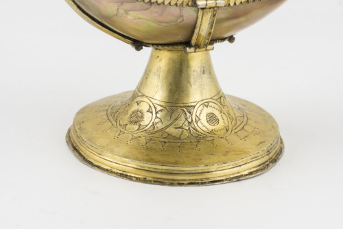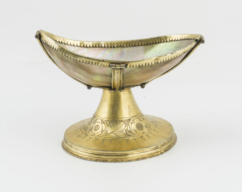 Base troncoconica svasata in argento dorato, con decorazione incisa costituita da quattro diversi fiori a cinque petali, intervallati da foglie arrotolate Sul margine inferiore vi è un fregio di piccoli archi scanditi da tre punti. Conca a forma di barca in madreperla, con montatura in argento dorato a bordi frastagliati con minuta punzonatura, collegata al piede da bande verticali