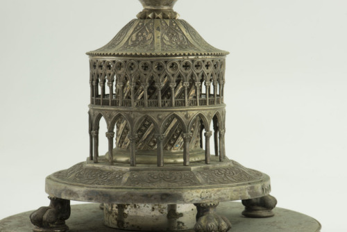 Piede circolare piatto, con zoccolo decorato da bugnature a punta di diamante. Piedistallo cilindrico, decorato a traforo da due serie di archi che imitano quelli di Palazzo Ducale, sorretto da quattro piedi a zampa di animale. Il fusto ha forma conica a sezione ottagonale, ed è decorato da un'altra doppia serie di archi gotici nella parte inferiore. I cinque bracci partono da un elemento di raccordo cilindrico, anch'esso decorato ad arcate gotiche; quattro di essi sono ricurvi, nel primo tratto tortili e nel secondo decorati a motivi floreali stilizzati. Il quinto braccio, posto al centro, è verticale con forma a bulbo ritorto a spirale. I bracci terminano tutti alla stessa altezza, e presentano un motivo ad archi ogivali posto alla base delle coppe, a cono svasato rovesciato, terminanti in un coronamento a merlature che riprende quelle di Palazzo Ducale
