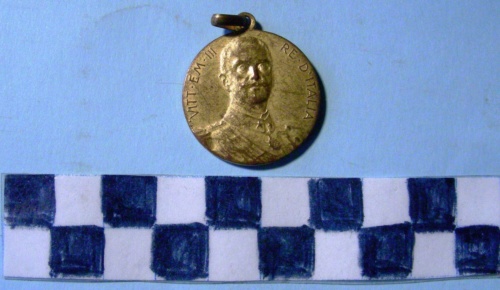 Di forma circolare. Sul recto, al centro in rilievo busto accollato a destra del papa con mozzetta d'ermellino, berretton e stola. Iscrizione lungo la corona. Sul verso, al centro, in rilievo busto di fronte del re in alta uniforme. Iscrizione lungo la corona. Anello all'appiccagnolo.