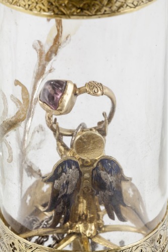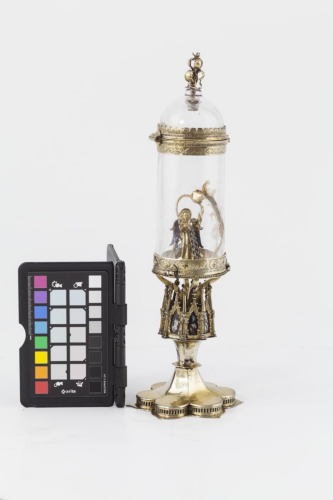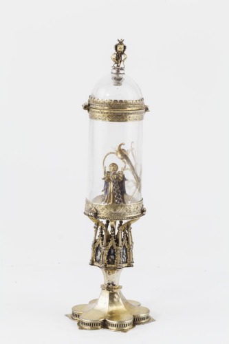 Base esalobata liscia con zoccolo piatto traforato. Fusto con nodo ottagonale composto da edicole a cuspidi gotiche con sfondi a smalto blu e volute a foglie d'acanto. La teca cilindrica in cristallo di rocca, sostenuta da quattro bracci, è profilata da due fascette in argento dorato incise con motivi a quadrilobi. Una frattura a forma di X è stata mascherata da ramoscelli d'oro dipinti. Al suo interno un angelo con ali smaltate di blu, verde e giallo regge un anello con rubino irregolarmente molato e lavorato a traforo, chiuso da un'alta montatura d'oro, collegata all'anello da giunture angolari, decorata ai lati da doppie palmette. La teca ha una copertura a cupola liscia, profilata da una corona di foglie piatte incise. La terminazione è composta da sei piccole foglie d'acanto, rinforzate internamente da lastre di smalto blu, rosso e verde, che reggono il calice di un fiore