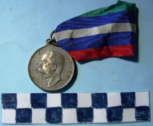 Di forma circolare. Sul recto, al centro, in rilievo busto accollato a sinistra di Umberto I. Sul verso, al centro, in rilievo iscrizione sotto stella raggiante a cinque punte. Nastrino a cinque strisce di colore, verde, blu, bianco, blu e rosso.