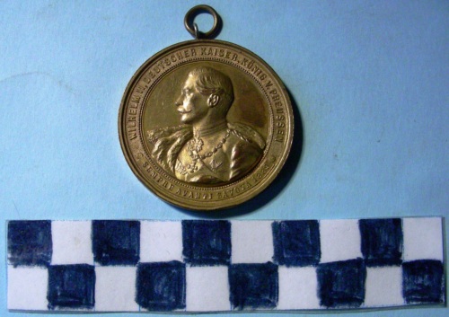 Di forma circolare. Sul recto, al centro, in rilievo, busto a destra di Umberto I con uniforme e cappotto su stemmi affiancati di casa Savoia e di Germania, contornati da rami di quercia e d'alloro. Iscrizione lungo la corona tra stella a cinque punte. Sul verso, al centro, in rilievo, busto a sinistra di Guglielmo II in alta uniforme, decorazioni e mantello. Iscrizioni lungo la corona e sotto la figura. Anello all'appiccagnolo.