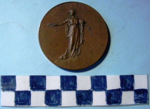 Di forma circolare. Sul recto, al centro, in rilievo la figura allegorica femminile dell'Italia turrita, con stella a cinque punte raggiante in capo, in piedi a sinistra, reggente un serto d'alloro ed una cornucopia. Iscrizione sotto la figura. Sul verso, al centro, in rilievo, iscrizione entro cartiglio tra rami di gelso, con bruchi, bozzoli e nastri. In basso stemma coronato della città di Milano.