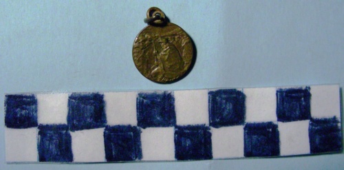 Di forma circolare. Sul recto, al centro, in rilievo il busto raggiante a destra del Bambinello stringente un ramo d'ulivo. Iscrizione ai lati della figura. Sul verso, al centro, in rilievo, sotto stella a cinque punte, una fila di soldati con mantellina e berretto, seduti in trincea con il fucile tra le mani. Doppio anello all'appiccagnolo.