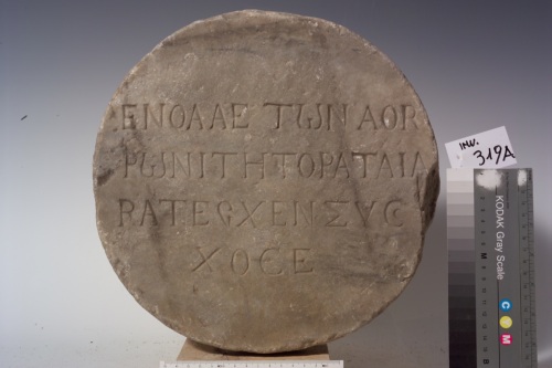 una lastra con decorazione medioevale è stata tagliata in età moderna per ricavarne un tondo sul cui retro è stata incisa un'iscrizione con lettere greche. Al di sopra di un listello è rappresentata una treccia a tre capi di nastro bisolcato e con fori di trapano all'interno della trama. In successione si hanno poi un motivo a torciglione e due solchi di cui uno più profondo.