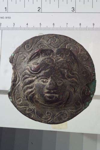 borchia in bronzo con al centro testa di medusa a rilievo contornata di motivi ornamentali a incisione.