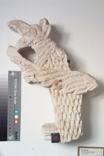 frammento di scultura raffigurante un grifo: il corpo dell'animale è leggermente arcuato e percorso da una fitta trama di scalpellature a forme romboidali che rappresentano il pelo. Al corpo si sovrappone una lunga ala con piumaggio ben definito da solchi a sezione triangolare. In corrispondenza del collo ci sono due striature. La testa aquilina è segnata da un grosso occhio a goccia, due orecchie e un lungo becco ricurvo. Il pezzo era pertinente ad una transenna.
