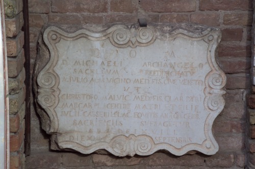 - ISCRIZIONI D.O.M. / D.∞MICHAELI ARCHANGELO / SACELLUM REEDIFICHATU / A IULIO MALVICINO MED.co FIS.co CIVE' VENETO / UT / CHRISTOFO.ro MALVIC.no MED.co FIS.co PATRI / MARGAR.TE PLACENTINE MATRI ET FILIE / IULII CASSERII PLAC.ni EQUITIS ANATOM.ci CELEB.mi / SACRIFICIIS SUFFRAGETUR / A.D. MDCLXVIII / IN DIE XXVIII SEPTEMBRIS - lettere capitali - latino