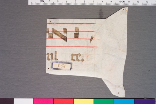 Iniziale ritagliata da un corale. Sul fronte tracce di tetragramma e di notazione quadrata; iniziale C (?) (non Ë stato possibile ricostruire il testo cui l'iniziale era posta a capo), su campo esterno blu decorato a biacca, di colore rosa pallido; nel campo interno, di colore rosa, due racemi rossi formano due ovali intrecciati, arricchiti, all'interno, da fiori e foglie su fondo blu e, all'esterno, da quattro foglie rotondeggianti; dal corpo della lettera si diparte un fregio costituito da racemo verde terminante in due foglie verdi e rosse con nervature a biacca. A tergo tracce di tetragramma e notazione quadrata. Una riga di testo solo in parte leggibile.