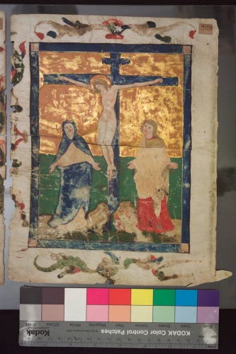 Foglio staccato da una mariegola di confraternita veneziana. Miniatura a piena pagina con Cristo crocifisso su fondo oro con la Vergine e San Giovanni Evangelista entro cornice a sua volta bordata su tre lati da tralcio d'acanto.
