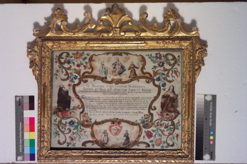 Voto di obbedienza, castità e povertà di Colomba Aloisia figlia di Francesco Quintavalle in presenza dell'Arcivescovo di Torcello Nicolò Sagredo e di Lucrezia Redenta Boldù, badessa del Monastero di Santa Caterina di Mazzorbo. L'iscrizione è racchiusa in cartiglio di color marrone a contornata da: in alto, entro cartiglio marrone Madonna con il Cristo in braccio su nuvole rosa affiancata da due santi e due teste di angelo; in basso, entro cartiglio, marrone, cuore con corona di spine contornato da fiamme e due santi oranti; ai lati altri due santi. // cornice dorata decorata a motivi vegetali.
