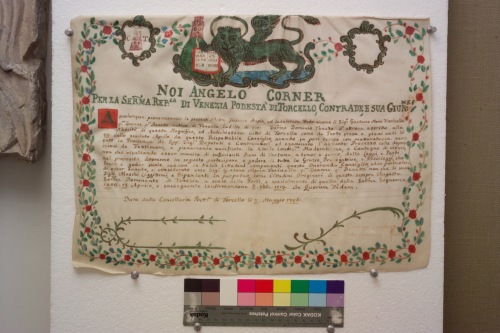 Fede rilasciata da Angelo Corner Podestà di Torcello attestante che Gaetano Maria Farinella q. Zuanne q. Benetto, nativo di Venezia Ë stato ascritto alla nobiltà di Torcello. Foglio pergamenaceo miniato con leone marciano andante a sinistra con libro aperto, tra due stemmi: a sinistra la città di Torcello, a destra lasciato in bianco. L'iscrizione è contornata da cornice floreale dai fiori rossi e le foglie verdi.Fede rilasciata da Angelo Corner Podestà di Torcello attestante che Gaetano Maria Farinella q. Zuanne q. Benetto, nativo di Venezia Ë stato ascritto alla nobiltà di Torcello. Foglio pergamenaceo miniato con leone marciano andante a sinistra con libro aperto, tra due stemmi: a sinistra la città di Torcello, a destra lasciato in bianco. L'iscrizione è contornata da cornice floreale dai fiori rossi e le foglie verdi.