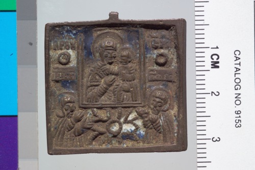 icona metallica portatile. Medaglia quadrangolare in bronzo con figure a rilievo su smalto azzurro e lavorata sulle due facce: sul recto L'icona della Vergine Hodegetria venerata da due santi. Sul verso vi sono simboli della Passione sul monte Calvario. Restano tracce del pendaglio.