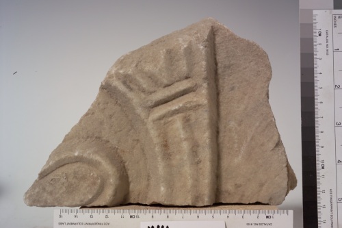 frammento di pluteo con decorazione a tralcio bisulcato: lo spazio compreso fra due rami nel loro punto di diramazione è occupato da una foglia.