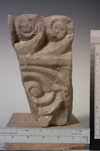 tra due listelli si sviluppa una decorazione viminea (monosolcata?) con volute. Al di sopra è presente un motivo a cani correnti.