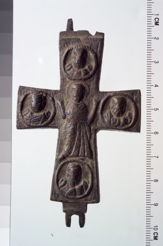valva anteriore di croce reliquiario con rappresentazione a rilievo (fusione) della Vergine orante a figura intera in posizione centrale e busti di santi (evangelisti?) in tondo sui quattro bracci.