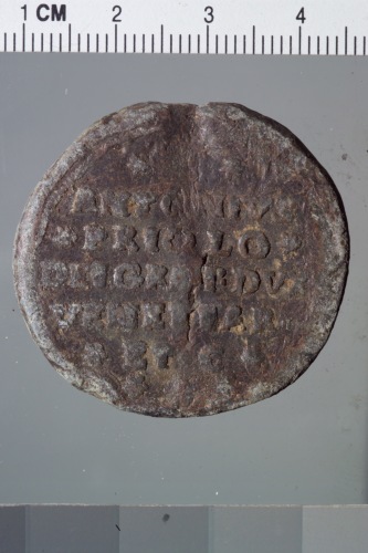 bolla plumbea del doge Antonio Priuli. Reca sul recto San Marco, a sinistra, regge con la destra un vessillo mentre il doge, a destra, reso di profilo e più piccolo del santo, regge l'asta del vessillo con la sinistra.