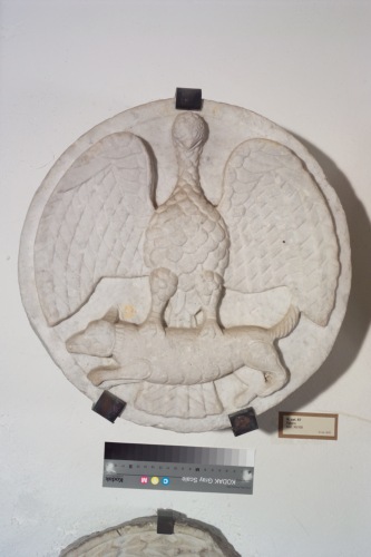 patera di forma circolare in cui Ë rappresentata un'aquila frontale ad ali spiegate mentre ghermisce un quadrupede non ben identificato. Le piume del volatile sono accuratamente definite su tutto il corpo.