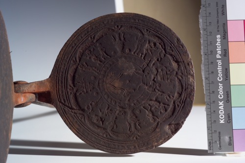 stampo a matrice circolare in ferro con lunghe braccia a tenaglia per ostie. Un lato della matrice presenta una decorazione con al centro uno stemma araldico poco leggibile tra figure stanti (angeli?) circondato da stelle. La fascia pi˘ esterna Ë decorata da quattro clipei con teste intercalati da quattro vasi (cantaros) affiancati da cornucopie e fiori. L'altro lato presenta al centro uno stemma gentilizio circondato da decorazione a ovuli (poco leggibile). Sulla fascia esterna quattro gruppi di tre angioletti intervallati da quattro cantaros e festoni di fiori e foglie.