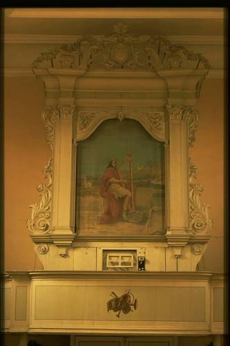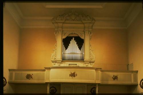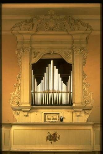 Op. 120: prospetto in unica campata, a cuspide centrale con ali laterali ascendenti, costituito da 27 canne in stagno del Principale 8', labbro superiore a mitria, canna maggiore: Sol1; andamento delle bocche: rettilineo; profilo planimetrico: rettilineo; alla base del prospetto erano le canne dei Tromboncini, oggi disperse. Consolle a finestra. Trasmissione meccanicasospesa. Una tastiera di 45 tasti in sesta, estensione Do1-Do5, diatonici ricoperti in bosso, con frontalini a chiocciola, cromatici in pero tinto di nero, in origine con intarsio lineare a 3 filetti (oggi scomparso), ripreso nei due blocchi laterali della tastiera, ove è stato ricoperto da una ridipintura recenziore. Pedaliera a leggio di 17+1 pedali in sesta, estensione Do1-Sol diesis2, costantemente unita alla tastiera. 18° pedale tamburo, cromatici non ricoperti, reali 12 note. Meccanica della pedaliera non più esistente. Quadro fonico alla destra dell'organista; registri azionati da tiranti a pomello in due file verticali; cartellini cartacei circolari.
