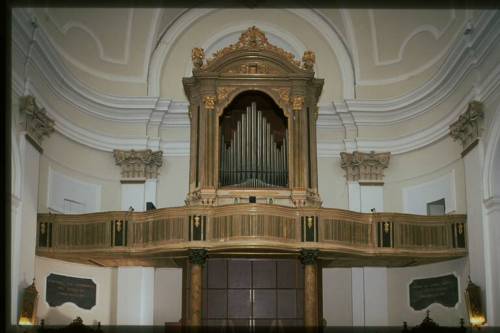 Prospetto in unica campata, a cuspide centrale con ali laterali ascendenti, formato da 21 canne in stagno, appartenenti al Principale I Bassi, labbro superiore. Canna maggiore Do1; andamento bocche rettilineo; profilo planimetrico rettilineo. Ai piedi del prospetto le canne ad ancia del Violoncello e dei Tromboncini. Consolle a finestra. Trasmissione meccanica sospesa. Una tastiera originale, cromatica, di 54 tasti, estensione Do1-Fa5, ricoperta in osso con frontalini in ebano; cromatici in pero tinto, con copertura superiore in ebano. Pedaliera diritta, non originale, cromatica, costantemente unita al manuale, di 26+1 pedali, estensione Do1-Do#3, reali 12 norte, 27° pedale Tamburo. Quadro fonico originale, alla destra dell'organista; registri azionati da tiranti a pomello ricostruiti in epoca recenziore (come la relativa catenacciatura), in due file verticali. Cartellini a stampa, a lettere capitali nere. Crivello in legno, foderato sopra e sotto con carta; bocche delle canne soprastanti, ad eccezione della Voce Umana.