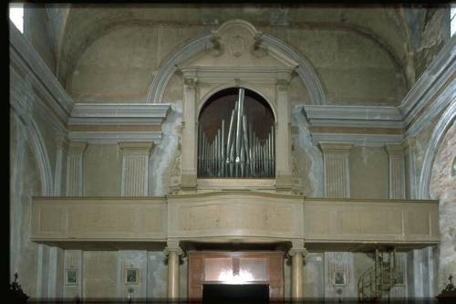 Prospetto in unica campata, a cuspide centrale con ali laterali ascendenti, formato da 23 canne in stagno, labbro superiore a mitria, appartenente al Principale 8. Canna maggiore Do1. Andamento delle bocche rettilineo, profilo planimetrico rettilineo. Consolle a finestra. Trasmissione meccanica. Una tastiera , originale, con prima ottava corta, di 54 tasti, estensioneDo1- La5, ricoperta in osso ed ebano. Pedaliera a leggio, in sesta, di 17+2 pedali, estensione Do1-Sol#2, reali 12 note, costantemente unita alla tastiera, 18° pedale Terza Mano, 19° Timballone; cromatici non ricoperti. Quadro fonico alla destra dell'organista; registri azionati da comandi a manetta a scorrimento orizzontale con incastro a sinistra, disposti in due file verticali; cartellini cartacei, a stampa, originali, stampatello minuscolo nero.