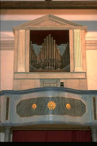 Prospetto in unica campata, a cuspide centrale con ali laterali ascendenti, formato da 27 canne in stagno appartenenti al Principale 8', la canna maggiore è il DO 2. Labbro superiore a scudo, andamento delle bocche rettilineo, profilo planimetrico rettilineo. Ai piedi del prospetto, le canne dei Tromboncini. Consolle a finestra. Trasmissione meccanica sospesa. Una tastiera, originale, in sesta di 45 tasti, estensione DO 1 - DO 5, ricopertain bosso ed ebano con intarsio lineare in bosso sui cromatici e lavorazione a chiocciola dei frontalini dei diatonici. Pedaliera, originale, a leggio, costantemente unita alla tastiera, in sesta di 17 più 1 pedali, estensione DO 1 - SOL# 2, reali 12 note, 18° pedale tamburo. Registri azionati datiranti a pomello, in legno dipinto di nero, in unica fila verticale; quadro fonico alla destra dell'organista; cartellini manoscritti, recenti.