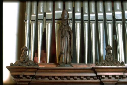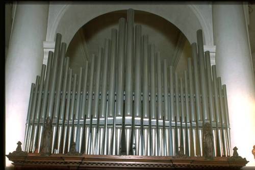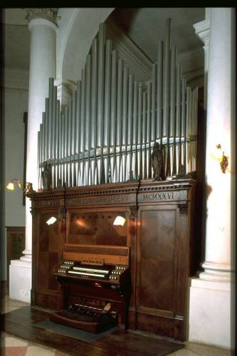 Organo costruito riutilizzando parte della fonica del precedente strumento ottocentesco di Giovanni Tonoli di cui resta, in cantoria in controfacciata le cassa vuota). Prospetto in unica campata, tre cuspidi, più due piccole ali ascendenti sopra la parte anteriore delle pareti laterali, costituito da 5+33+5 canne in stagno tigrato, appartenente al Principale 8' del G.O., con baffi, labbro superiore a scudo sporgente. Canna maggiore Do1, andamento bocche: campata centrale rettilineo; ali sopra le pareti laterali, parallelo all'andamento delle sommità; profili planimetrici rettilinei. Consolle addossata al corpo dell'organo. Trasmissione meccanica a bilancia per i manuali, elettrica (in origine pneumatica) per il pedale e l'azione dei registri. Due tastiere originali, cromatiche, di 61 tasti, estensione Do1-Do6, ricoperte in osso ed ebano. Pedaliera originale, concava parallela, indipendente, di 30 pedali, estensione Do1-Fa3. Registri con tiranti a pomello, in tre file orizzontali, a ciascun lato delle tastiere, disposte in gradoni: alla sinistra i registri dell'O.E. e del Pedale, alla destra quelli del G.O.. Cartellini circolari, in ceramica bianca, con bordo dorato,applicati frontalmente sui pomelli stessi. Scritte a stampa, corsivo nero moderno, con iniziali maiuscole. I cartellini dei registri sono stati rifatti dal restauro Salvato. Crivelli in legno foderati sopra e sotto con carta; bocche delle canne soprastanti.