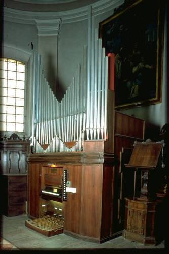 Prospetto in unica campata, a due ali contrapposte discendenti verso il centro, formato da 26 canne (25 in stagno, appartenenti al Principale 8', canna maggiore Fa1, più una finta in zinco), labbro superiore a mitria con puntino in rilievo alla sommità; in origine il prospetto era a cuspide con ali laterali discendenti; alla base del prospetto sono posti i Tromboncini, dalla tipica forma mantovana, chiusi superiormente e con foro anteriore,accordati con chiavetta filettata e pressore curvilineo, anziché, come di consueto, con gruccia e pattino. Ai lati del prospetto, due ali discendenti, ciascuna di 6 canne recenti in zinco alluminato, con labbro superiore ascudo sporgente, del taglio dei registri violeggianti, poste su due somierini pneumatici a pistoni, non funzionante né collegati all'apparato trasmissivo. Le dodici canne suddette formano un'ottava cromatica. Andamento delle bocche in facciata: rettilineo, profili planimetrici: rettilinei; le due ali laterali di 6 canne in zinco sono angolate di circa 135° rispetto alla campata centrale. Consolle a finestra. Trasmissione meccanica sospesa. Una tastiera di 50 tasti, con prima ottava corta, estensione Do1-Fa5, ricoperta in osso ed ebano, di vecchia fattura. Pedaliera cromatica di 27 pedali (reali 12 note), estensione Do1-Re3, di fattura (probabilmente) Quaglio, costantemente unita alla tastiera. Quadro fonico, pure di fattura probabile Quaglio, alla destra dell'organista; registri a manetta a scorrimento orizzontale, con incastro a sinistra ed impugnatura tornita. Cartellini circolari in materiale plastico, incisi, stampatello minuscolo nero, con iniziali maiuscole, applicati frontalmente nelle impugnature delle manette.