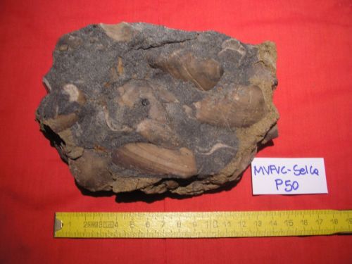 goccioline di ambra e gusci di bivalvi in arenaria vulcanogena.
