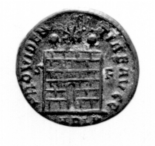 Dritto: CONSTANTINVS AVG.;testa diademata di Costantino I a destra. Rovescio: PROVIDENTIAE AVGG.; portale di accampamento con due torrette; sopra, stella; ai lati, S-F; in esergo, ARLP