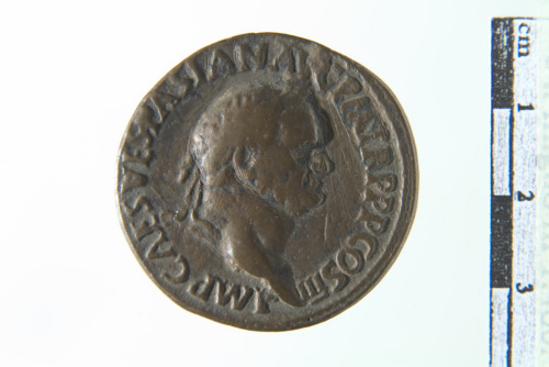 Dritto: Busto laureato di Vespasiano a d.; contorno perlinato. Rovescio: Veduta prospettica panoramica del Colosseo; a s. "Meta Sudans", a d. struttura architettonica a due piani con quattro colonne; contorno perlinato