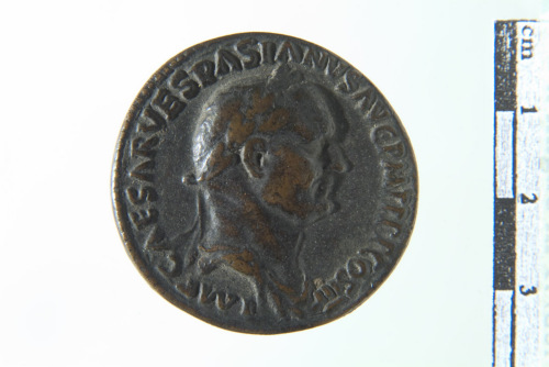 Dritto: Busto laureato di Vespasiano a d.; contorno perlinato. Rovescio: La Fortuna stante a s. con cornucopia e timone poggiante su globo; contorno perlinato