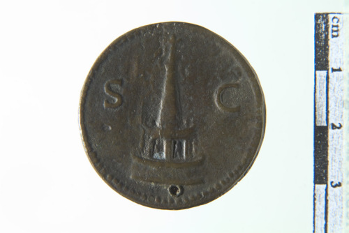 Dritto: Busto laureato di Tito a s.; contorno perlinato. Rovescio: Colonna su piattaforma ornata di statue (Meta Sudans?); contorno perlinato