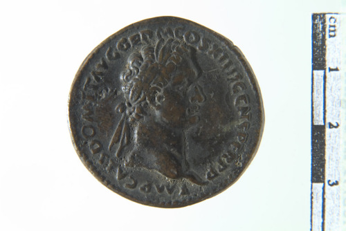 Dritto: Busto laureato di Domiziano a d.; contorno perlinato. Rovescio: L'imperatore seduto a s. su piattaforma, su cui SVFPD, con la mano destra protesa verso una figura virile con bambino, con mano protesa a d.; sullo sfondo un tempio; contorno perlinato