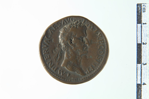 Dritto: Busto laureato di Nerva a d.; contorno perlinato. Rovescio: L'imperatore seduto a d. su sedia curule su suggestum, con rotolo, assiste alla distribuzione di doni a un cittadino che sale sul piedistallo; sullo sfondo Minerva stante frontalmentela Liberalitas e un aiutante stante a s. con tessera annonaria; contorno perlinato