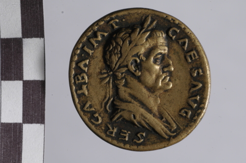 Dritto: busto laureato e drappeggiato di Galba a d.. Rovescio: scena di adlocutio: Galba in abito militare su bassa piattaforma con un ufficiale davanti a lui, sotto di lui due soldati: uno con scudo e trofeo, l'altro con scudo e asta e tra loro un cavallo, dietro altri due soldati