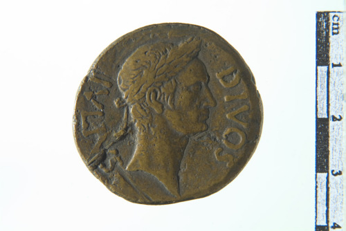 Dritto: testa laureata di Giulio Cesare a d.. Rovescio: nel campo a s. in basso L.BVCA al centro del campo caduceo e fascio littorio incrociati, sopra a s. scure, sopra a d. mani in fede, in basso a d. globo con fasce