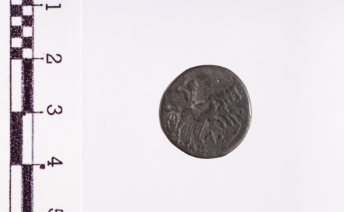 Dritto: Testa elmata di Roma a s.. Rovescio: Saturno in quadriga a d. tiene con la s. le redini e con la d. un'arpa, es. [L.SA]